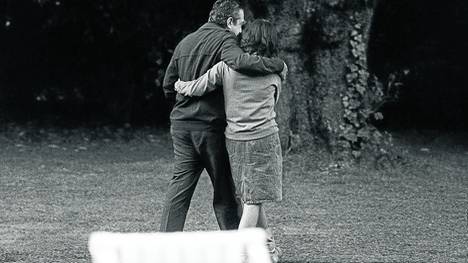Intimidad. Alfonsín acaba de enterarse que ganó y es Presidente electo. Pasea por los jardines de Don Torcuato abrazando a su hija Marcela./ DANI YAKO