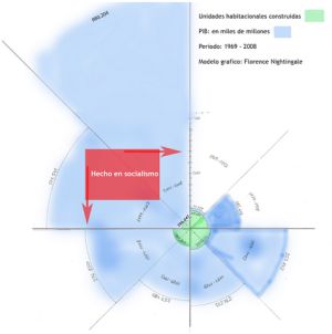 Dicho de otro modo, el chavismo construyó (hasta 2010) un 14% de las viviendas construidas en décadas anteriores, por gobiernos que contaban con presupuestos ínfimos en comparación. Cabe afirmar: el producto interno bruto combinado de los gobiernos de la democracia, pre arribo del caudillo al poder, fue de 1,6 billones de dólares aproximadamente; el producto interno bruto del régimen de Chavez hasta el 2011 había sido 1,8 billones de dólares aproximadamente, y eso sin contar deuda interna y externa adquirida. El gráfico adjunto ayuda a poner de relieve el inobjetable fracaso en ese aspecto.