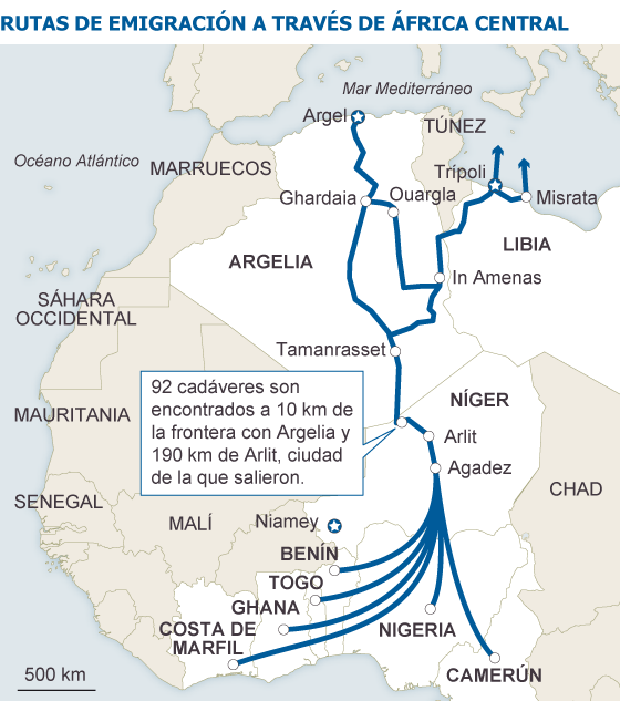 Las personas que perecieron víctimas del agotamiento y la falta de agua perseguían el mismo objetivo que los centenares de ahogados el mes pasado en las aguas del Mediterráneo en su intento por llegar a la isla italiana de Lampedusa: escapar de la miseria. En este caso no eran somalíes, sirios o eritreos. Eran nigerinos que trataban de escapar de las múltiples crisis que sufre su país. Un Estado de 17 millones de habitantes y 1.260.000 kilómetros cuadrados —más del doble de la superficie de España— que padece hambrunas, sequías, contaminación industrial y el azote del integrismo islamista.