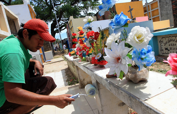 La gente cumple con la limpieza de los nichos y tumbas de sus familiares para esperar el feriado del Día de los Difuntos. Foto: Fuad Landívar