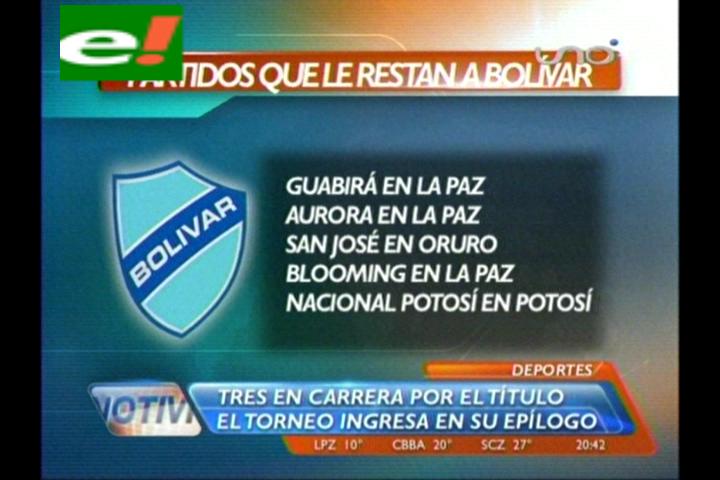 Bolívar, San José y The Strongest se perfilan como los favoritos para obtener el título de la del Torneo Apertura de la Liga Profesional del Fútbol Boliviano (LPFB) a cinco fechas de su conclusión. Con menos posibilidades, Wilstermann y Universitario lucharán por alguno de los premios internacionales.