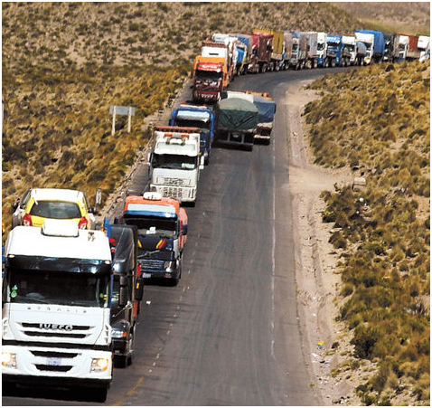 El presidente de la Cámara Departamental de Transporte Pesado de La Paz, Álvaro Ayllón, dijo en declaraciones a radio Fides que más de 1.500 transportistas se encuentran parados en Tambo Quemado y Pisiga, en la frontera con Chile, sin que cuenten con la necesaria provisión de alimentos.