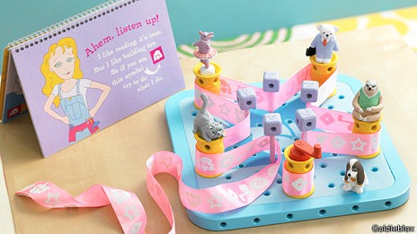 Goldieblox, que está orientado para un público de entre 5 y 9 años, consiste básicamente en un libro y en una plataforma de plástico en el que se pueden ubicar distintos objetos prediseñados que le permiten a la niña construirse su propia diversión.