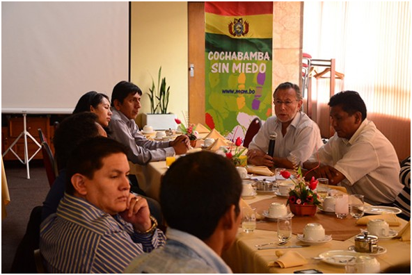 Dirigentes del MSM explican los “cinco compromisos con Bolivia” en Cochabamba, ayer. Foto Los Tiempos.