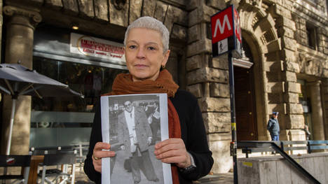 Cristina Mihura con la foto de Bernardo Arnone, frente al consulado argentino en Roma donde presto declaración por Operación Condor en video conferencia con magistrados Baires.