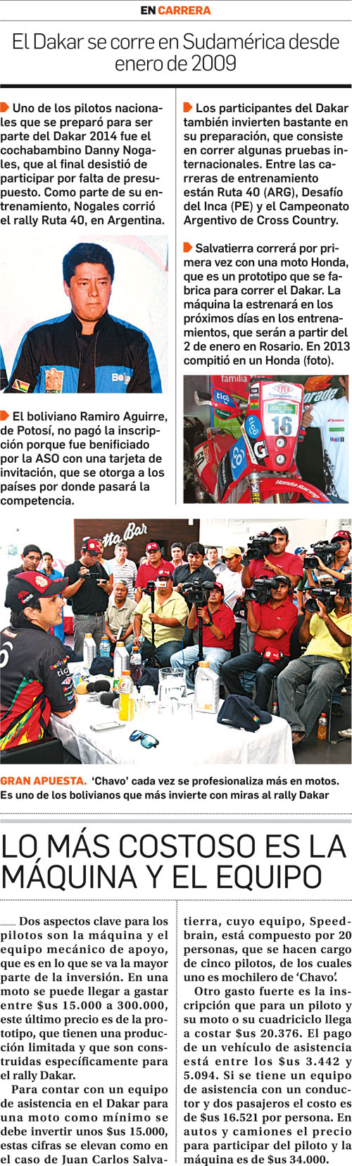 “Con toda la preparación estoy a la par de los pilotos que se ubican entre los 20 primeros”, agregó Salvatierra, que es el único representantes nacional que ha logrado acabar el Dakar en tres ocasiones. En 2011 fue 36, en 2012 terminó de 31 y en 2013 de 29.