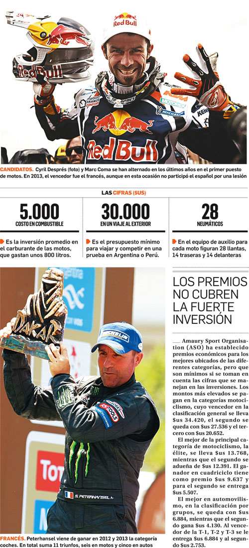Presupuesto. Para correr el Dakar, los pilotos invierten entre $us 200.000, que son los que aspiran solo a llegar, hasta más de $us 2.000.000, que son los que apuntan a los primeros lugares