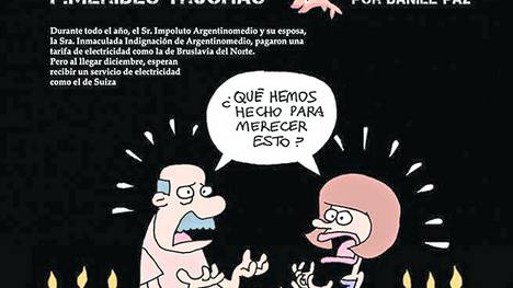 Ahora acaba de producirse un fenómeno exactamente inverso. Tras la caricatura “kirchnerista” –si se la puede calificar de alguna manera– de Daniel Paz en el diario oficialista Página/12, sobrevino un aluvión de críticas que no fueron dispuestas verticalmente desde la cima del poder. Paz criticó al argentino promedio, según su visión. Y convirtió a las víctimas en victimarios, de algún modo, de los cortes de luz. Acusó en su dibujo y en el texto alusivo al “Sr. Impoluto Argentino” y a “Su esposa la Sra. Inmaculada Indignación de Argentinomedio” por haber pagado una tarifa de electricidad como “la de Bruslavia del Norte”,y de “exigir un servicio de electricidad como el de Suiza”.