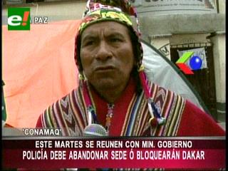 La amenaza de bloquear al Rally Dakar en el territorio boliviano, proferida por dirigentes del Consejo Nacional de Ayllus y Markas del Qullasuyu (Conamaq), no se concretará si es que la Policía Nacional abandona la sede de esta organización. Desde el pasado 11 de diciembre, efectivos de la fuerza del orden se encuentran resguardando la sede del Conamaq, ubicada en la zona de Sopocachi de La Paz, luego de que se registraran enfrentamientos entre los miembros de esta organización por la elección de la nueva dirigencia.