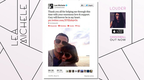 Este año, el tuit más compartido en la red social vino de la mano de un triste evento: fue el primer mensaje de la actriz norteamericana Lea Michele luego de la muerte de su entonces pareja, Cory Monteith, quien falleció el pasado 13 de julio. Monteith era actor de la serie norteamericana Glee, en la que actualmente se desempeña Michele.