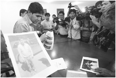 El viceministro de Régimen Interior, Jorge Pérez (f), muestra las fotos del supuesto cabecilla encarcelado.