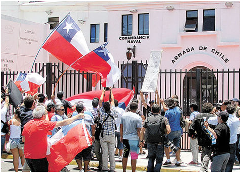 “El que no salta es cholo” y “que la Armada de Chile defienda Arica” fueron algunas de la frases que gritaban los manifestantes. Pasado el mediodía la manifestación se dirigió hasta la Intendencia Regional, donde estaba el ministro chileno del Interior Andrés Chadwick, quien oyó el fallo junto al intendente, José Durana, y el alcalde de la ciudad, Salvador Urrutia.