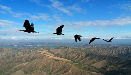 Cinco ibis eremitas vuelan en formación. / Markus Unsöld (AP / NATURE)
