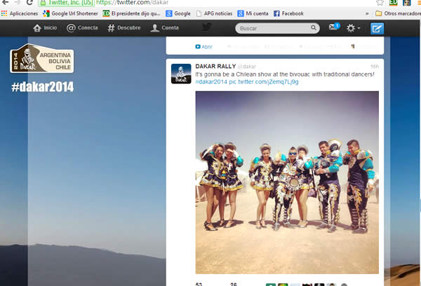 La cuenta oficial del rally Dakar, en la red social de internet Twitter, mostró ayer una fotografía de la tradicional danza boliviana de los caporales pero identificándola como una manifestación cultural chilena.