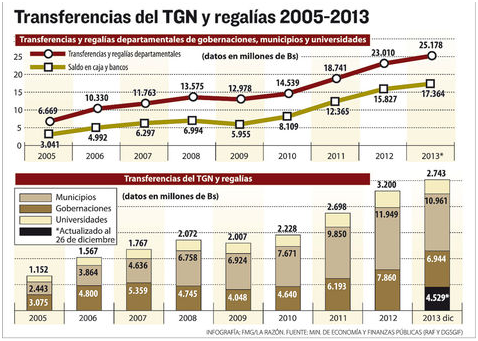 Los datos señalan que la transferencia anual de recursos del TGN y regalías a los gobiernos subnacionales y el sistema universitario estatal se incrementó de Bs 3.730 millones ($us 536 millones) en 2003 a 23.010 millones (3.306 millones) en 2012. Al 26 de diciembre del año pasado, este monto ascendió hasta Bs 25.178 millones ($us 3.617 millones).