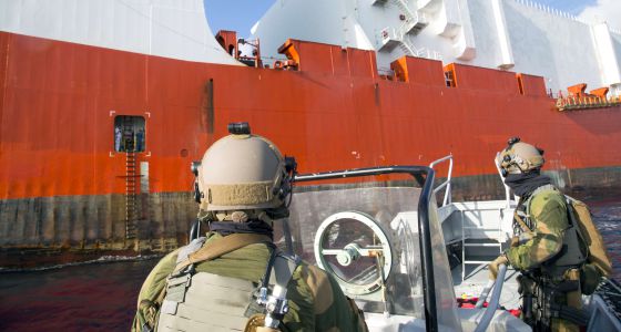 Miembros de las Fuerzas Armadas de Noruega escoltan un barco con arsenal químico de Siria a inicios de enero. / AFP