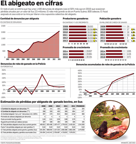 Así como el caso del ganadero Tarabillo, hay 345 denuncias formales sentadas ante la Policía y 804 abigeatos sin denuncias solo en Santa Cruz, donde se estima que ocurre el 75% de los robos de ganado de élite. En todo el país se estima que hay unas 1.400 denuncias (casi 50% más que en 2010) que ocasionan pérdidas anuales por un valor de $us 2,5 millones, según la Confederación de Ganaderos de Bolivia (Congabol) y la Federación de Ganaderos de Santa Cruz (Fegasacruz).
