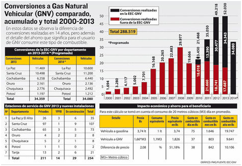 El director general ejecutivo de la Entidad Ejecutora de Conversión a Gas Natural Vehicular (EEC-GNV), Hernán Vega, informó a La Razón que, según el Registro Único para la Administración Tributaria Municipal (RUAT), el parque automotor de Bolivia a 2013 llegó a 1.205.356 autos, y de esta cantidad el 24% (288.519) usa gas natural. Añadió que esas transformaciones se hicieron desde 2000 hasta diciembre de 2013 (14 años).