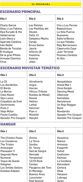 Gonzalo Gómez, organizador de la selección nacional, detalló que el festival tendrá tres escenarios: el principal, donde estarán las bandas más importantes; el temático de Movistar, que dedicará el sábado al rock, el domingo al heavy metal y el lunes al reggae. Y el hangar, que dará espacio a los músicos independientes en crecimiento.