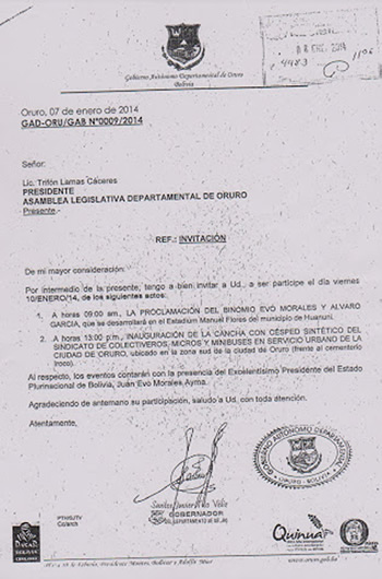 La invitación escrita que el gobernador  Santos Tito envió al presidente de la Asamblea Legislativa Departamental de Oruro, Trifón Lamas Cáceres, tiene dos puntos: la convocatoria a la “proclamación del binomio (del Movimiento Al Socialismo) Evo Morales y Álvaro García Linera, a desarrollarse en el estadio Manuel Flores de Huanuni”, y la inauguración de una cancha de césped sintético en la zona sur de la ciudad de Oruro.