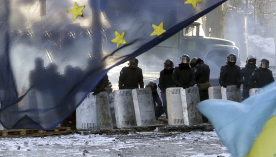 Varios policías antidisturbios tras una bandera de la UE en Kiev. / MAXIM SHIPENKOV (EFE)