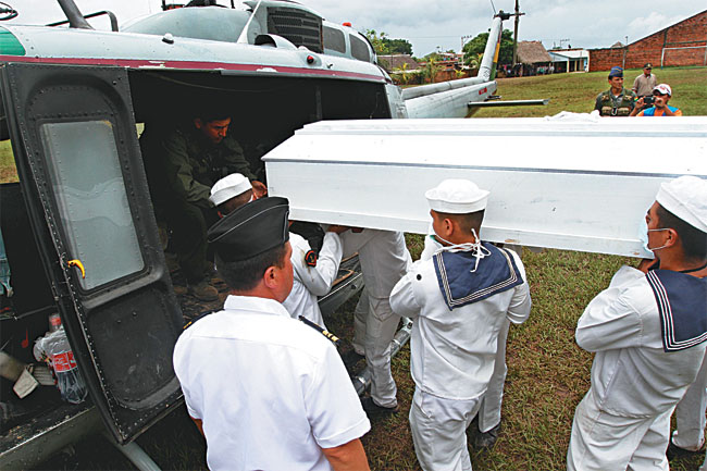 El cuerpo del soldado Olsen Ayala fue enviado ayer a Oruro en un helicóptero de las Fuerzas Armadas. Foto: Rodrigo Urzagasti