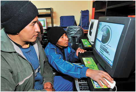 Computación. Dos personas utilizan los ordenadores del telecentro del distrito rural Hampaturi (La Paz), de la Alcaldía. Foto: GAMLP