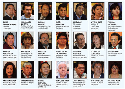 El presidente Evo Morales ratificó hoy al grueso de su gabinete ministerial que, a partir de la fecha quedó constituido por 21 carteras de Estado debido a la creación del primer Ministerio de Deportes, cuya conducción quedó en manos de Tito Montaño.