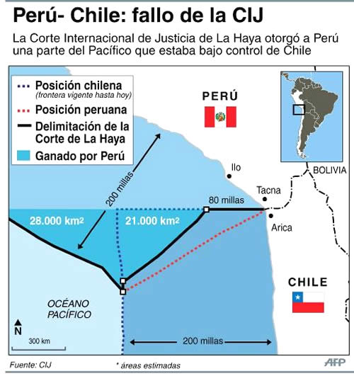 En un fallo histórico, la Corte otorgó a Perú una parte del Pacífico que estaba bajo control de Chile. La sentencia reconoció la existencia de una frontera marítima que sigue el paralelo hasta las 80 millas, como sostenía Chile, y más allá de ese punto dio razón a Perú hasta las 200 millas.