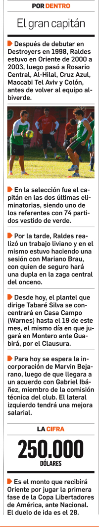 El de ayer fue un día inolvidable para el mundo orientista, que vio el regreso de uno de sus hijos pródigos. Ronald Raldes se puso otra vez la camiseta de Oriente y se convierte en el gran refuerzo del equipo este año. En una semana el club, que comanda José Ernesto Álvarez, tiró la casa por la ventana apuntando a ganar el Clausura y a avanzar de fase en la Copa Libertadores de América, más allá de que el tiempo apremia. El defensor firmó hasta mediados de 2015.