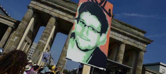 Una manifestación a favor de Edward Snowden delante de la Puerta de Brandeburgo, en Berlín. / AFP