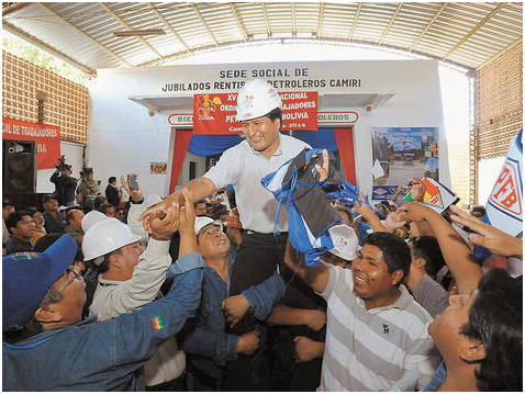 Acto. Morales es alzado en hombros por los trabajadores petroleros. Ocurrió en Camiri el 5 de enero. Foto: ABI