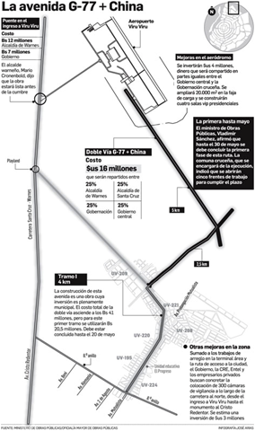 El Gobierno, la Gobernación y las alcaldías de Warnes y de Santa Cruz de la Sierra confirmaron ayer la construcción de la vía alterna de ingreso a la ciudad desde el aeropuerto Viru Viru. La avenida, que será denominada G-77 + China, tendrá una longitud de 7,5 kilómetros, significará una inversión de $us 16 millones y su ejecución estará dividida en dos fases, la primera será concluida hasta el 30 de mayo y la segunda, hasta el 31 de diciembre de este año.