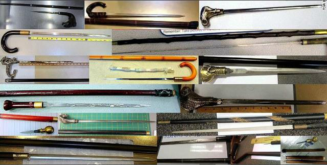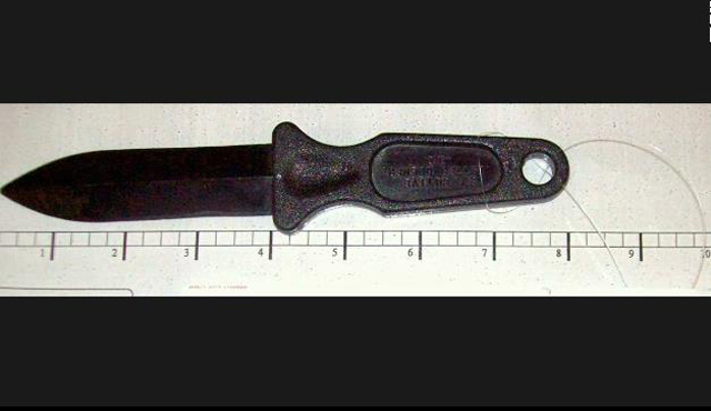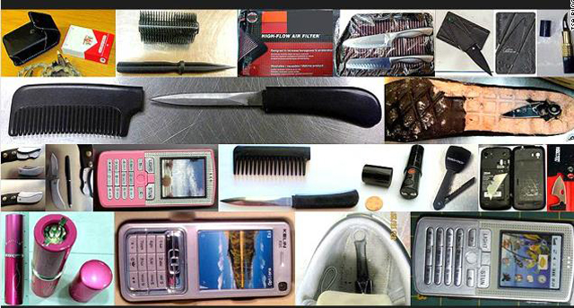 “Nuestros oficiales frecuentemente encuentran bastones espada, cuchillos de tarjetas de crédito, cuchillos de hebillas de cinturón, cuchillos de peine/cepillo, cuchillos escondidos en los zapatos, cuchillos escondidos en termos y cuchillos escondidos en el forro de las bolsas cerca del mecanismo del mango.