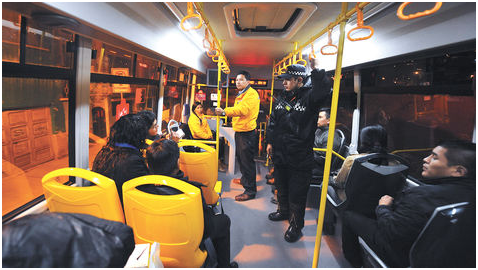 Resuelta la discusión, el resto, junto con un funcionario edil, aborda el bus. Dos anfitriones, hombre y mujer, dan la bienvenida. Ella cobra el pasaje de trasnoche (Bs 3,00) y lo registra en una computadora, mientras él brinda información sobre el servicio. No trabajan en parejas, solo que el varón, que trabajará en la Ruta 3, Chasquipampa-PUC, que aún no está en funcionamiento, aprovecha para ganar experiencia.