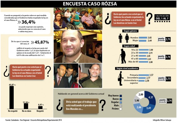 La encuesta realizada por el Foro Regional, conformado por Ciudadanía, el Centro de Estudios de la Realidad Económica y Social (Ceres) y Los Tiempos, detectó una baja credibilidad en el “caso Rosza”. Cuando se preguntó a los encuestados en qué medida consideraban que el Gobierno había respetado la ley en el caso, el 36,4 por ciento no pudo expresar una opinión aduciendo que no conocía el caso o que sabía muy poco.