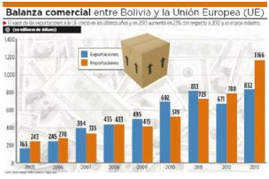 La UE ofrece un mercado de 500 millones de personas con alto poder adquisitivo. Por el momento Bolivia exporta productos agropecuarios, bienes semimanufacturados y minerales, aunque el 90% de sus exportaciones puede ingresar al bloque libre de aranceles.
