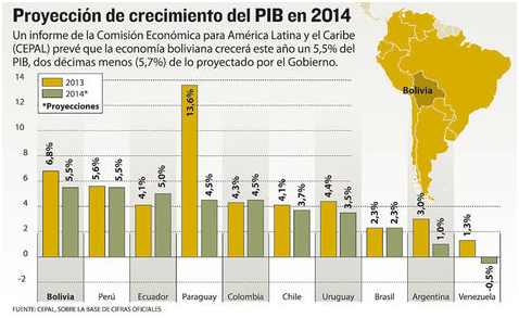 La Comisión Económica para América Latina y el Caribe (CEPAL) prevé que Bolivia, junto a Perú, liderará el crecimiento económico de Sudamérica en esta gestión, con un avance del 5,5% del Producto Interno Bruto (PIB). Este índice está por debajo del 5,7% proyectado por el Gobierno para 2014.