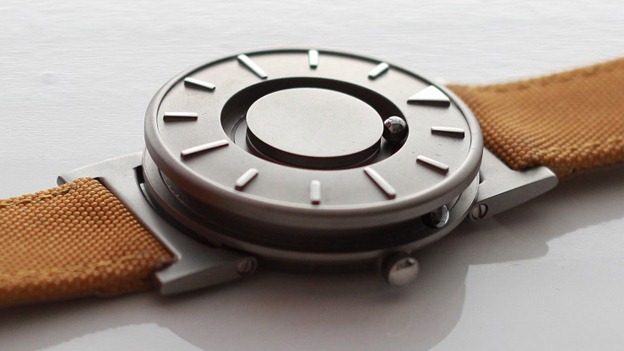El reloj tiene una esfera de titanio circular. No tiene agujas ni números. Alrededor de una ranura en el centro una bola marca los minutos, y en el borde del reloj otra bola marca las horas.