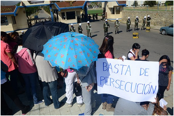 «Estamos apostadas al frente de la Brigada Aérea porque estamos pidiendo que se cumpla la CPE, las leyes contra la discriminación y ellos (el Alto Mando) no dan paso a nuestras solicitudes, al contrario, a nuestros esposos les han dado memorándums de cambio de destino como amedrentamiento», dijo Marcela Chiquiri, representante de las esposas de los suboficiales y sargentos de las FFAA.