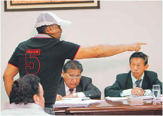 La audiencia fue detenida en dos oportunidades. La primera fue cuando Villegas identificó a un sujeto al que sindicó como agente de Inteligencia. Inmediatamente reaccionó Edward Mollinedo, que arrebató la gorra al sujeto que estaba sentado detrás de él y acto seguido lo increpó diciéndole: “¿Por qué me haces esto si trabajamos juntos en contra de los delincuentes? Deja de amedrentarnos, ya está bueno”.