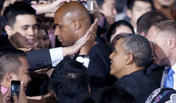 Barack Obama choca su mano con un joven en un encuentro en la Universidad de Malaysia, en Kuala Lumpur. / BARBARA WALTON (EFE)