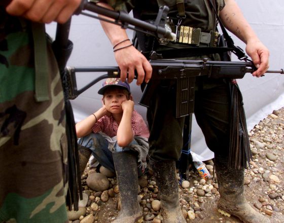 Un niño entre los guerrilleros de las FARC en San Vicente del Caguán, en el año 2000. / REUTERS
