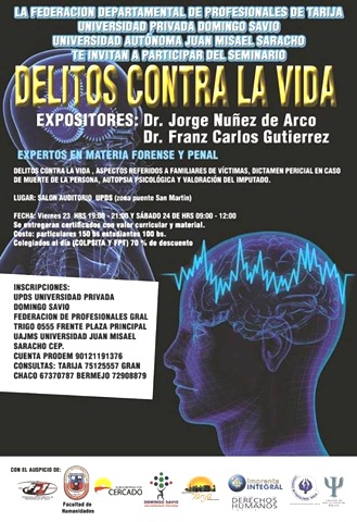 Hoy, viernes 23 de mayo, en la ciudad de Tarija la Federación de Profesionales conjuntamente con una serie de instituciones académicas llevarán adelante el seminario Delitos Contra la Vida, evento que contará con la participación de dos reconocidos profesionales: el Dr. Franz Carlos Gutiérrez, de reconocida trayectoria en el ámbito penal, quien abordará la temática del proceso penal en caso de muerte; y del Dr. Jorge Núñez de Arco, psiquiatra con estudios en derecho y psicología, autor de varios libros en el área y miembro de la Academia de Ciencias Forenses de Bolivia, quien abordará la temática de la autopsia psicológica.