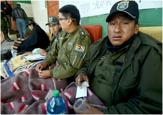 Uniformados de Santa Cruz, Cochabamba, Oruro, Tarija y La Paz se declararon en estado de emergencia  e incluso representantes de algunas de esas regiones llegaron a La Paz para reforzar la protesta instalada en la oficina de la Asociación Nacional de Suboficiales, Clases y Policías (Anssclapol).