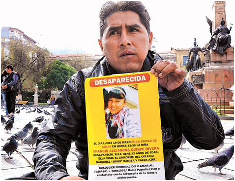 “Llegaré hasta el último, hasta encontrarla”, advirtió Martín Quispe, padre de Francis Alejandra Quispe Rivera, de 12 años, desaparecida hace 35 días en Sucre. Él la busca en los lenocinios ya que le amenazaron con prostituirla.