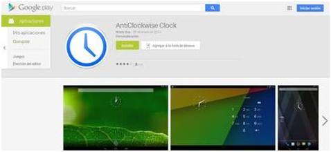 La primera de ellas envía al usuario a la aplicación AntiClockwise Clock o Antihorario, que proporciona un widget o pequeño programa de pantalla de inicio y la pantalla de bloqueo con la figura de un reloj con los números al revés.