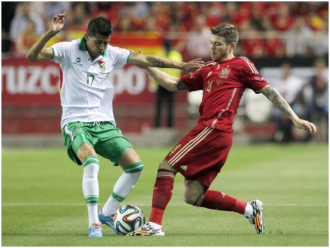 El defensa de la selección española Alberto Moreno (d) y el centrocampista de Bolivia, Juan Carlos Arce luchan por el balón durante el partido amistoso que disputaron en Sevilla, antes del Mundial. Foto: EFE.