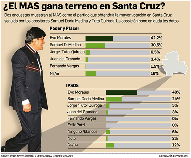 Personalmente creo que el MAS no ha crecido en Santa Cruz. El histórico muestra que su porcentaje siempre osciló entre 39 y 42% (en 2009 obtuvo 40,95), y eso se ha mantenido. Yo creo que el MAS está en su piso tradicional en Santa Cruz, pero el problema es que la oposición ha bajado. Antes representaba en bloque del 49 al 54%, pero ahora ha caído al 30%. Lo que  ha crecido son los indecisos y el indeciso no es el masista o el que antes votó por el MAS; sino el que votó por la oposición y ahora no sabe por quién votar.