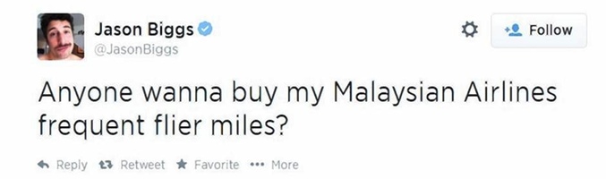 Jason Biggs ha causado revuelo en las redes sociales al publicar un tweet bromeando sobre el accidente del vuelo de Malaysian Airlines en Ucrania. Cabe recordar que se trata de la misma compañía del avión desaparecido el pasado 8 de marzo.